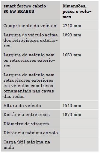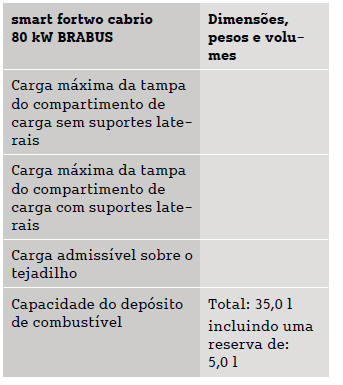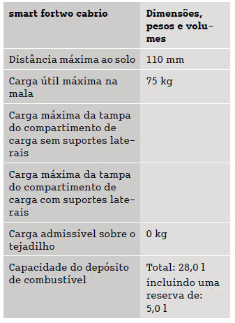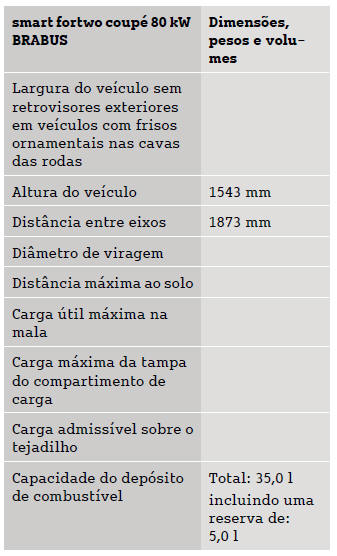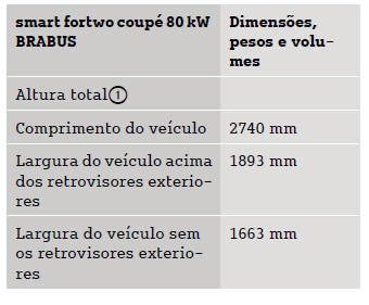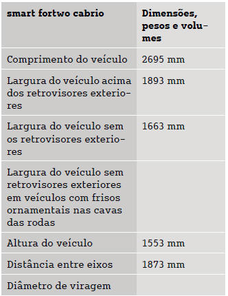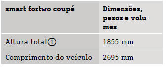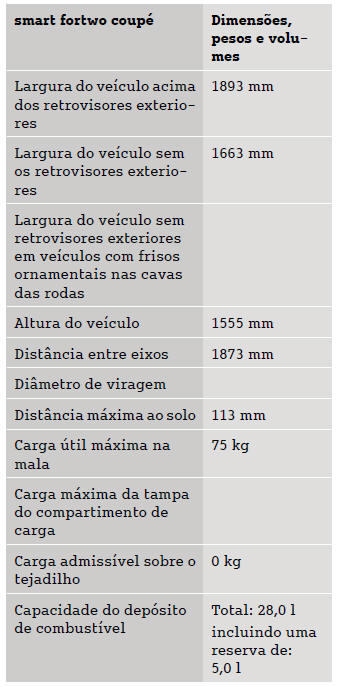 Smart Fortwo: Dimensões e pesosOs dados técnicos em falta ainda não estavam disponíveis à data da impressão.